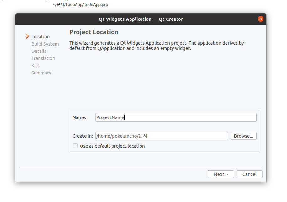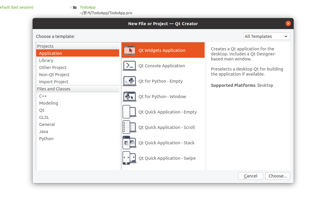 (1) File | New File or Project | Application | Qt Widgets Application 선택